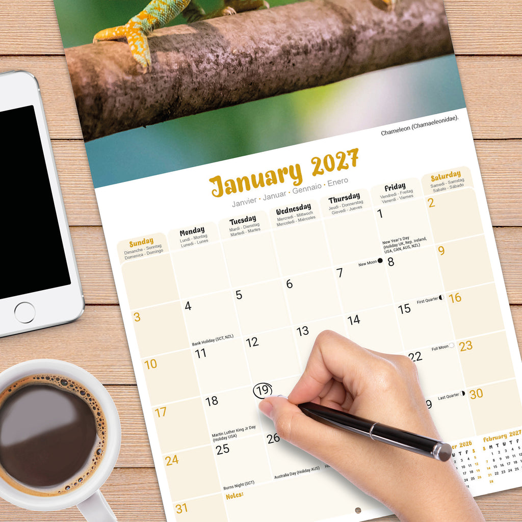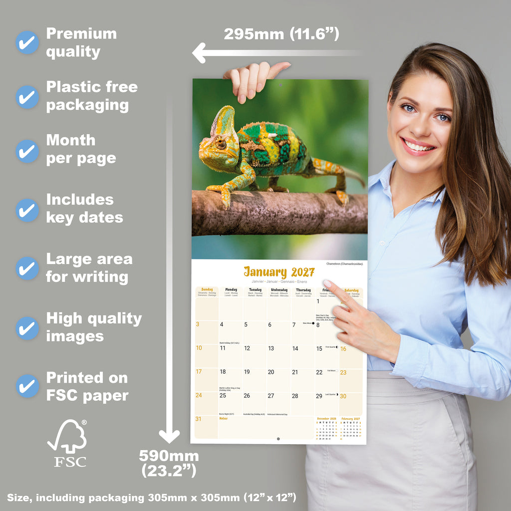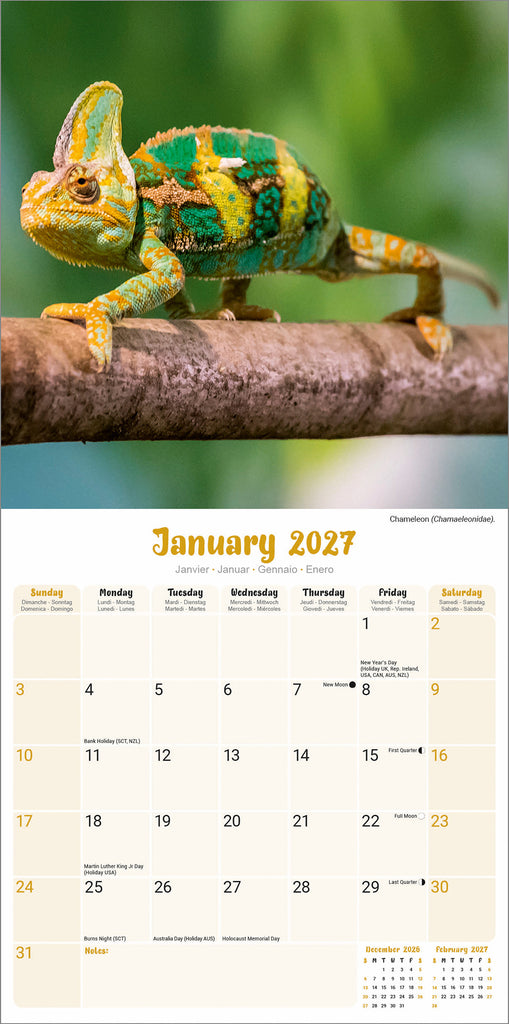 A 16 month calendar that can be used from September 2026, containing images of Lizards. There are more than 3,800 species in existence and this wall calendar will delight admirers of these amazing creatures, with fabulous imagery each month of the year. The calendar contains all public holidays, notable events & important dates. The Calendar also features large grids for making notes of those special dates to remember.