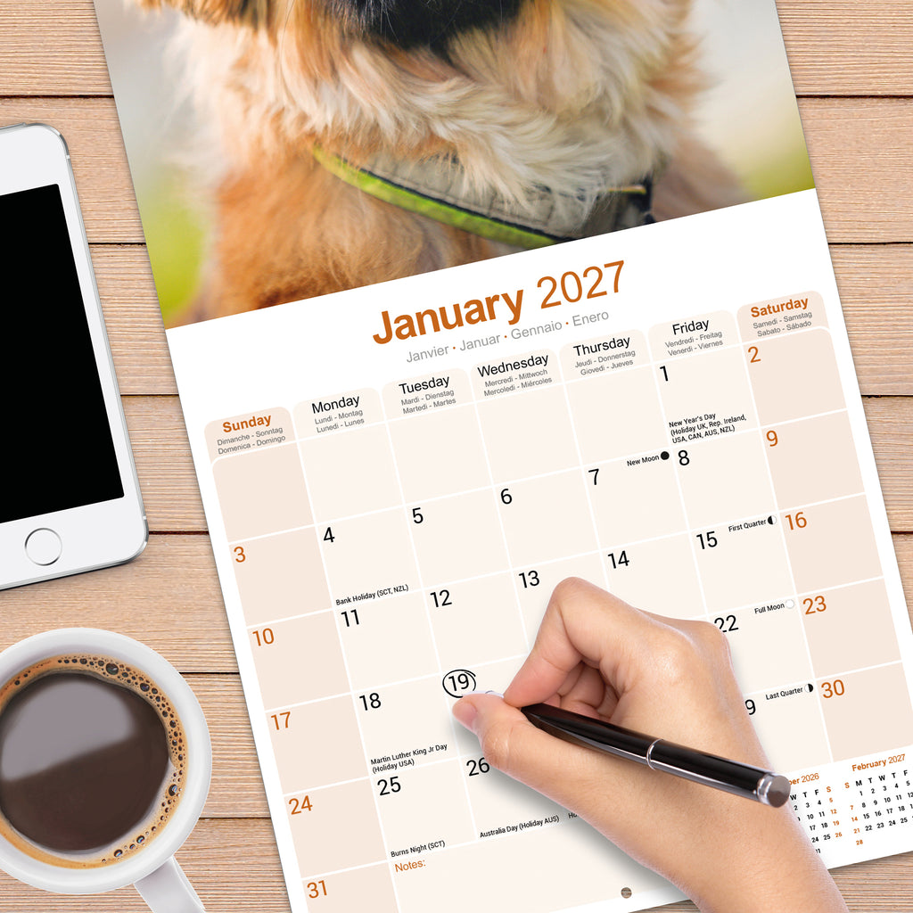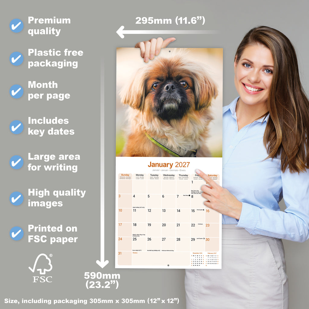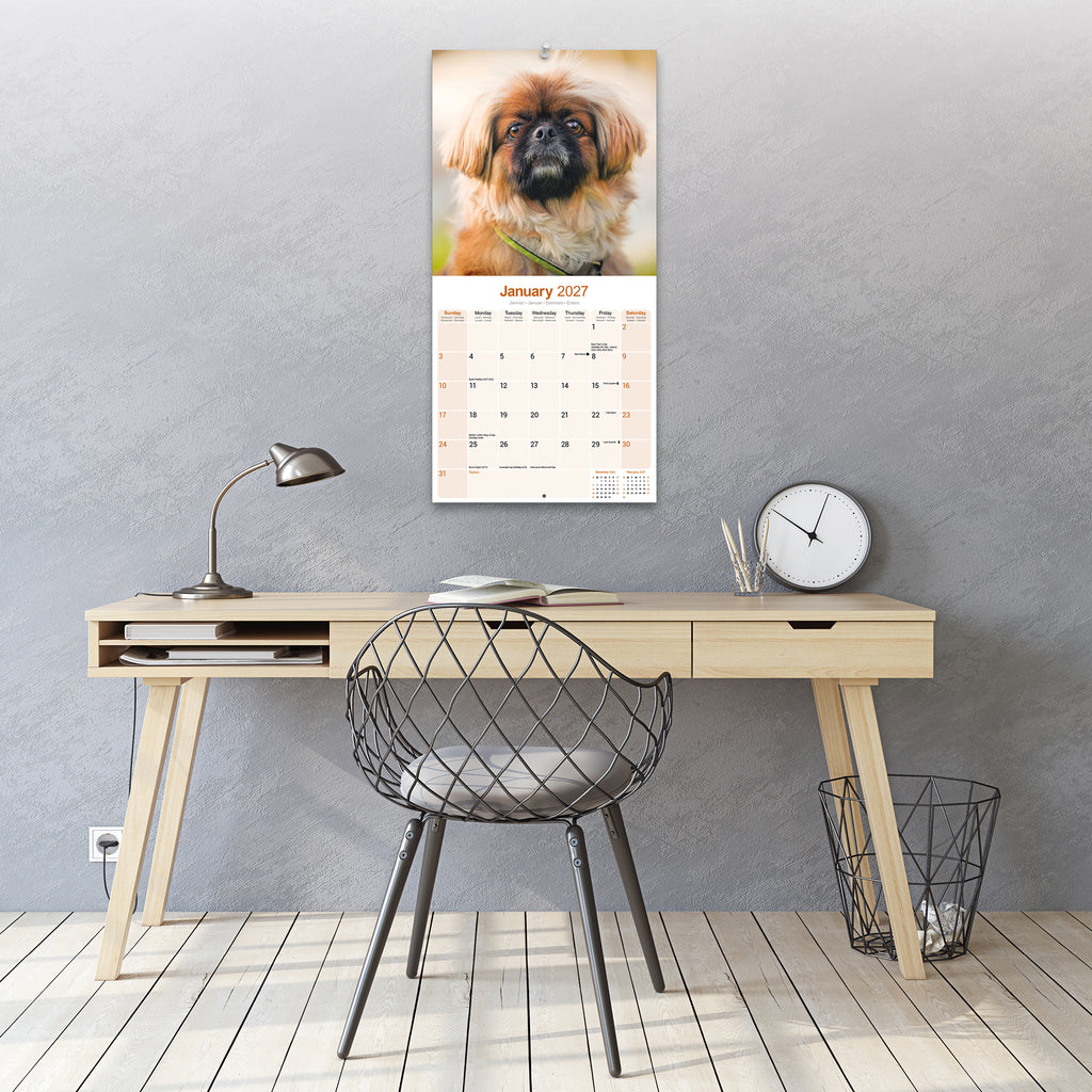A 16 month calendar that can be used from September 2026 containing 13 beautiful images of your favourite dog breed, the Pekingese. The calendar contains all public holidays, notable events & important dates. The Calendar also features large grids for making notes of those special dates to remember.